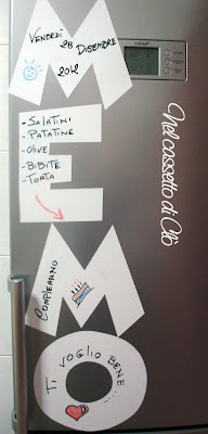 Dal foglio magnetico ho ritagliato la parola " MEMO "ed essendo le lettere staccate tra loro si possono spostare e posizionare a piacere sulla portella del frigorifero !!